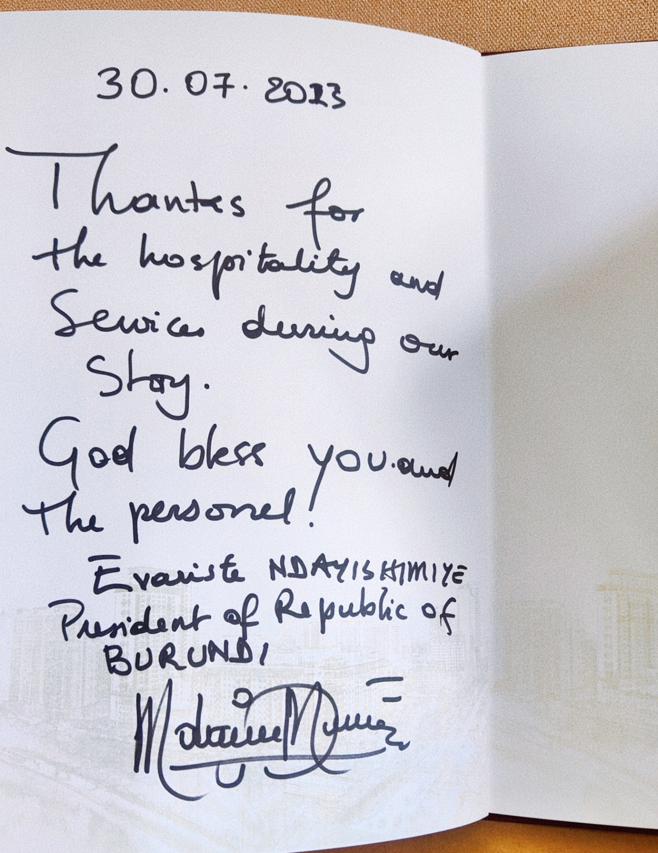 國家領(lǐng)導(dǎo)人及夫人離館之際,在金牛賓館親切問候了賓館以黨科同志為代表的服務(wù)保障團(tuán)隊(duì)成員,表達(dá)了對(duì)川菜的喜愛,夸贊川菜“巴適”,并表示在金牛賓館可以享用到正宗的川菜,稱贊金牛賓館是有傳統(tǒng)的賓館。布隆迪總統(tǒng)恩達(dá)伊施米耶在錦江賓館留言簿上留言,表示了對(duì)錦江賓館此次接待的感謝,并與接待人員合影留念。
