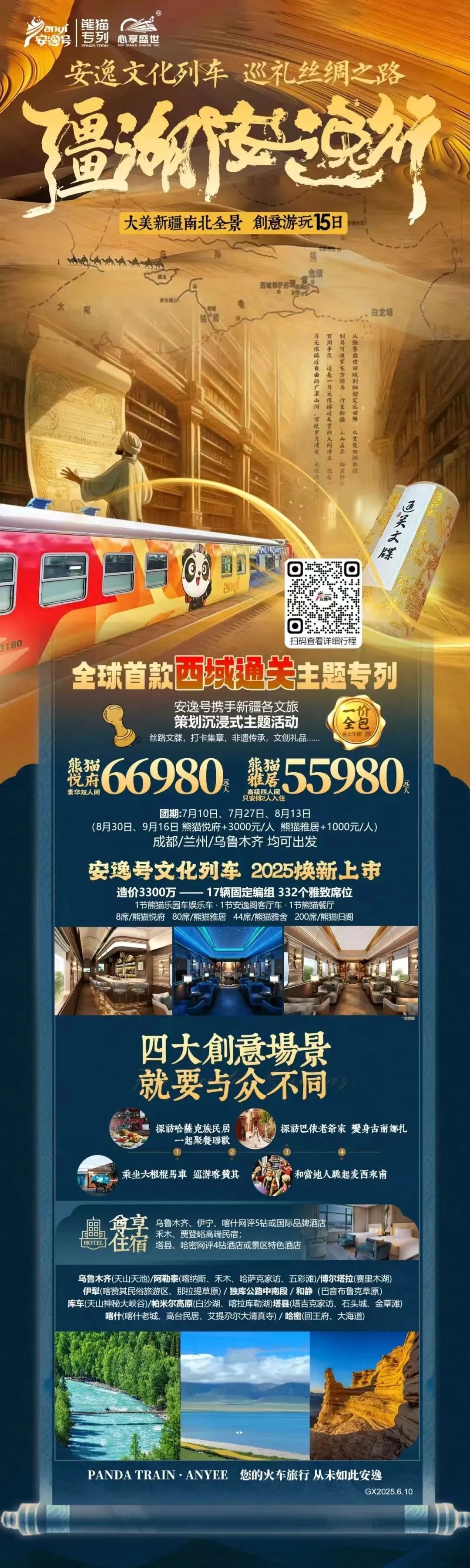 6月23日6時23分,隨著汽笛長鳴,身披全新涂裝的“安逸號”熊貓專列從成都西站緩緩駛出,開往烏魯木齊站,正式開啟2025年首趟新疆全景環(huán)線之旅。此次開行標(biāo)志著改造升級后的“安逸號”熊貓專列以更高品質(zhì)的服務(wù)亮相,為游客帶來更舒適的“鐵路+旅游”體驗。
