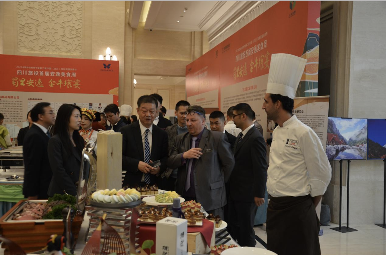 10月31日,省尊龍凱時集團在金牛賓館舉辦“蜀里安逸·金牛饗宴”首屆安逸美食周活動,創新消費場景,以美食帶動旅游,以美食促進消費。集團黨委書記、董事長任丁致辭,并與集團黨委副書記、副董事長、總經理周曉陽,商務廳二級巡視員鄭鵬斌,文旅廳二級巡視員王燕林等嘉賓共同啟動美食周開幕儀式。